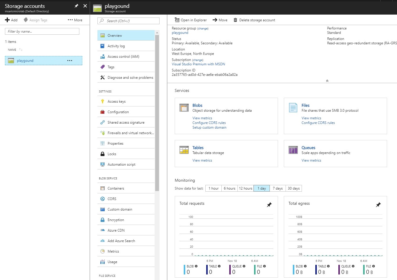 One thing that is interesting from a developer’s perspective are Access Keys. Access Keys are very important part of the storage account and are used in Azure Storage SDK for accessing your storage. Access Keys are also used in WebJobs and Functions as AzureWebJobsDashboard and AzureWebJobsStorage connection strings (one key can be used for both).