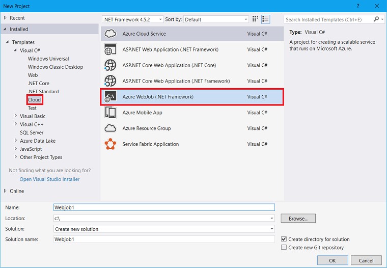Now that we have everything let’s create a new WebJob by creating a new Cloud Template Azure WebJob: