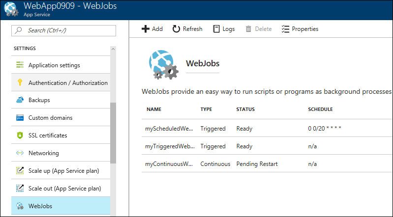 The new WebJob appears on the WebJobs page from where you can stop, restart, delete, set the properties or view the log of all your WebJobs.