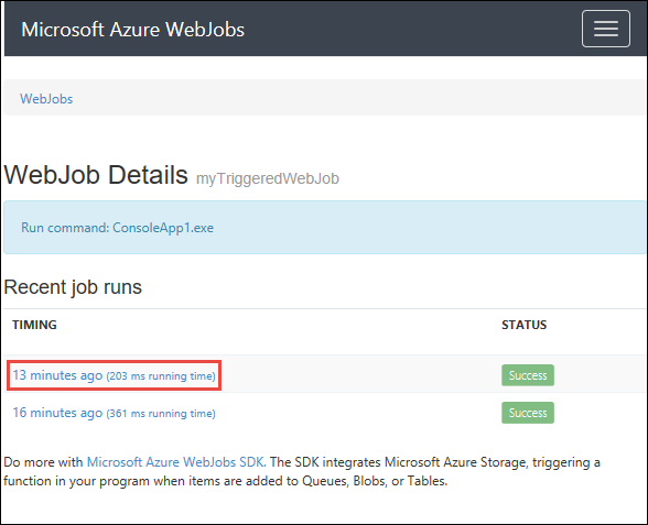 You will be redirected to WebJobs details page where you will see all executions of the WebJob and you can examine each one individually: