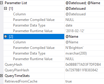 If we look at the execution plan of second execution we will see that index on Name column is being used. Also let’s look at the compiled parameter values against run-time parameter values.